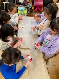 工作では、粘土を使って「ミニ達磨づくり」をしました。目標達成といった縁起物を可愛く仕上げたり個性的な達磨たちが製作されました。