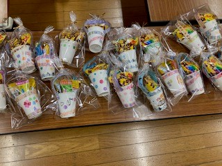 2月の工作は、バレンタイン工作として紙コップで作れるお菓子入れを作りました。