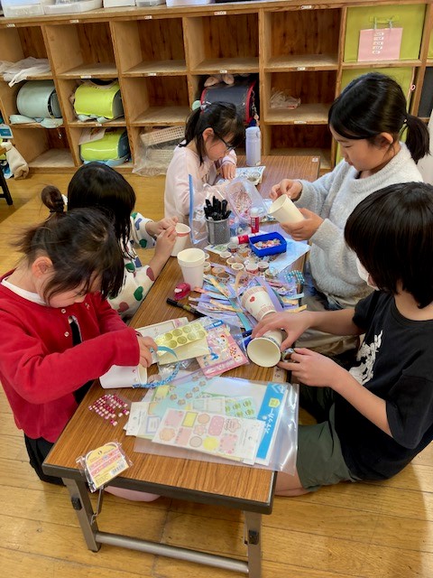 持ち手もつけて各自で自由に装飾を施して、自分だけのお菓子入れを作る事が出来ました。